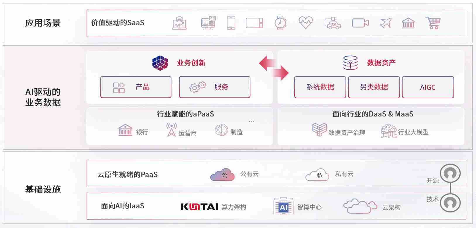 数字时代,,围绕企业数字化转型的关键要素,,尊龙旗舰厅数码开创性的提出数云融合战略和技术体系框架,,着力在云原生、、、数字原生、、、AI原生和信创产业上架构产品和服务能力,,为处在不同数字化转型阶段的快消零售、、、、汽车、、、金融、、医疗、、、政企、、、、教育、、、运营商等行业客户提供泛在的敏捷IT能力和融合的数据驱动能力,,构建跨界融合创新的数字业务场景和新业务模式,,助力企业级客户建立面向未来的核心能力和竞争优势,,,,全面推动社会的数字化、、智能化转型升级。。
